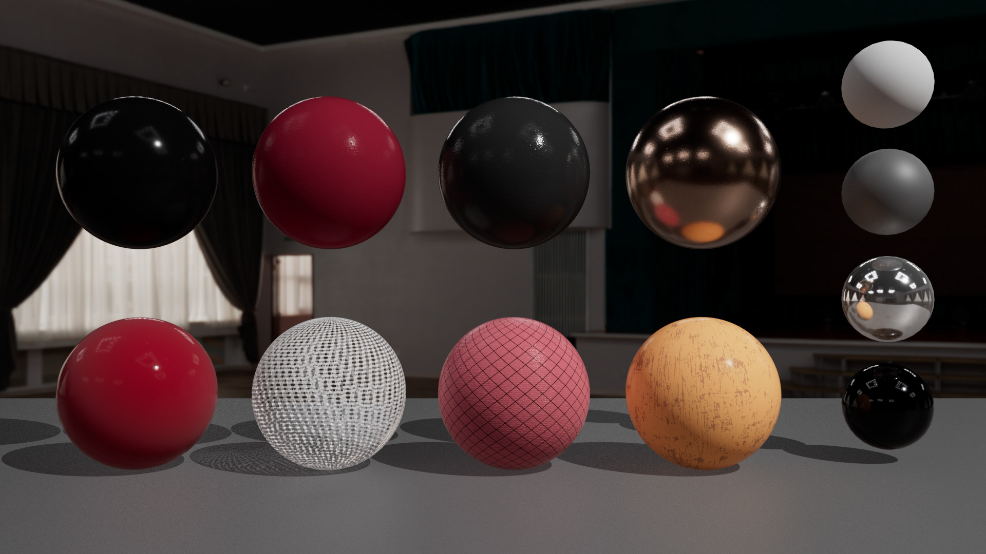 The first row is in order of the stage floor, red plaster wall, black plaster wall, and gold. The second row is the velvet red curtain, thin curtain, chair cloth, and chair wood. Although the renders from two software doesn't match yet, I will be using this as the reference in order to close the gab between them.